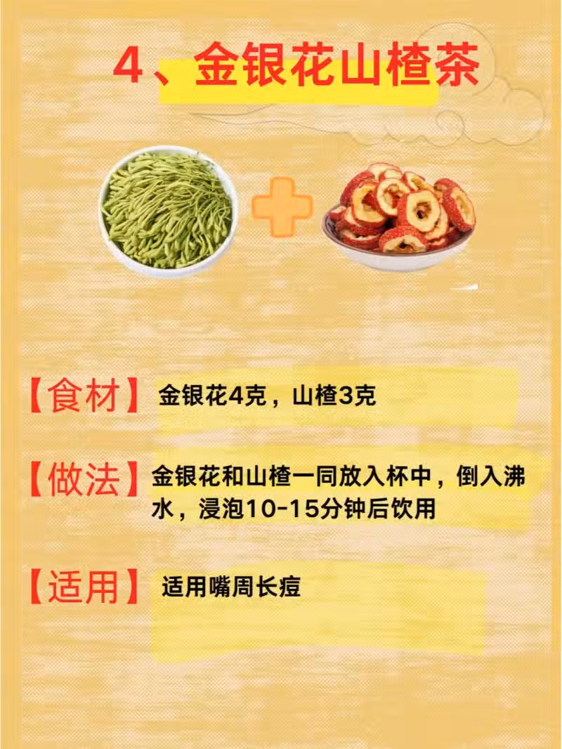 山楂消食解膩、活血化瘀,搭配金銀花,不僅能改善因飲食不規律、熬夜導致的內分泌失調型痘痘,還能促進消化,一舉多得!