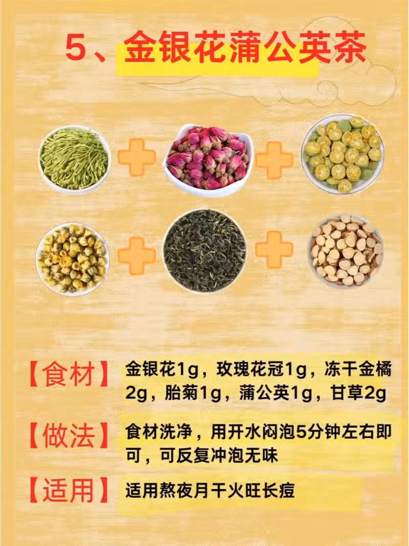 蒲公英清熱解毒能力超強,和金銀花組合,堪稱「祛痘王炸」!對紅腫發炎的痘痘有奇效,快速消炎鎮靜,讓肌膚重歸健康狀態。