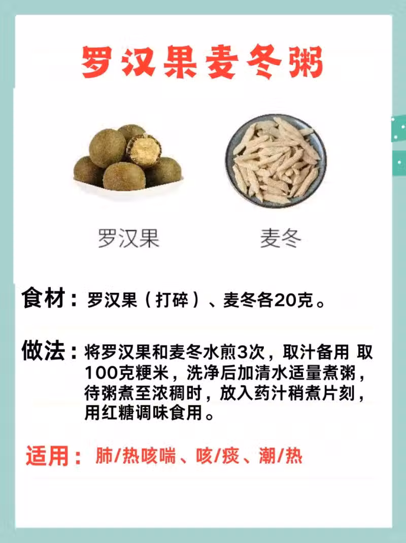 將羅漢果敲碎與麥冬一同熬煮,濾渣取汁後加入粳米熬粥。麥冬滋陰潤燥,與羅漢果搭配,能為乾燥的呼吸道注入滿滿「水潤能量」,清甜粥品滋養身心,特別適合咽干、乾咳人群。