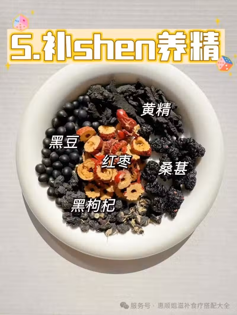 食材:黃精10克、黑豆30克、紅棗3顆、桑葚30顆、黑枸杞5克