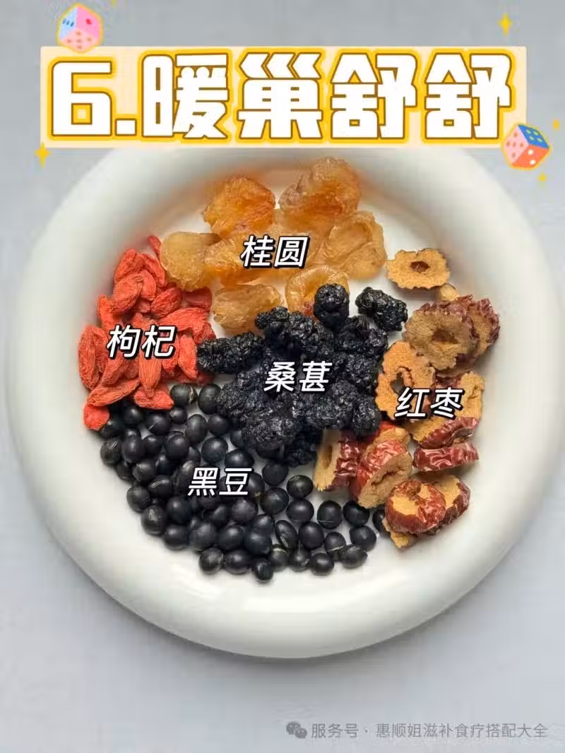 食材:桂圓5顆、枸杞19克、桑葚30克、黑豆30克、紅棗3顆