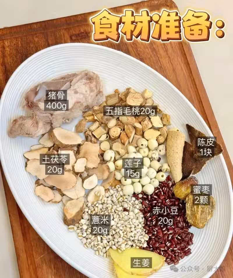 食材:五指毛桃20g ,土茯苓20g ,蓮子15g ,薏米20g ,赤小豆20g ,豬骨適量 , 蜜棗2顆 ,陳皮1塊 ,生薑