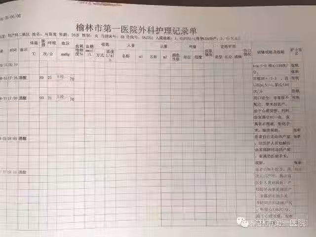 「經過我們初步診斷,馬某第一胎41+1周待產,經過檢查我們發現胎兒頭部偏大,一般足月胎兒雙頂徑在90mm左右,但是馬某的胎兒雙頂徑為99mm,所以陰道分娩難產風險比較大。」檢查後醫護人員就向產婦、家屬說明情況,並建議剖宮產,然而家屬堅持順產,產婦馬某、其丈夫延某分別在《產婦住院知情同意書》上簽字並按了手印,同時其丈夫延某在後面寫有:「情況已知,要求經陰道分娩,諒解意外」「情況已知,要求靜滴縮宮素催產,諒解意外」在榆林市第一醫院外科護理記錄單上顯示,17時50分,產婦向醫護人員提出剖腹產的要求,醫護人員徵求家屬意見時,家屬稱表示理解,但拒絕手術,繼續觀察。