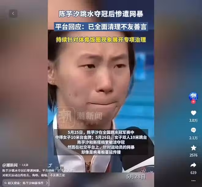 陳芋汐被惡評「保送金牌」,官媒力挺,評論區淪陷