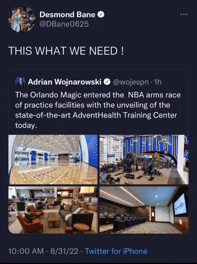 來到魔術之後,第一次發布會,貝恩直接現身,猛夸魔術隊的這個訓練場館,誇他們很先進,然後轉身就怒斥灰熊,他爆料灰熊的訓練館真是差到什麼程度:「那麼大一訓練場連個窗戶都沒有,他管那地方叫『地牢』。不僅僅如此,他還在說,魔術整個的訓練場環境也好,空氣也新鮮,還能去那外面陽台上吃東西,這才是頂尖的訓練館,而且這裡球迷也特別好。」