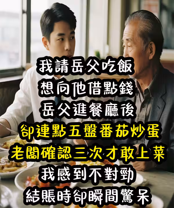 我請岳父吃飯,想向他借點錢,岳父進餐廳「卻連點五盤番茄炒蛋」老闆確認三次才敢上菜!我感到不對勁,結帳時卻瞬間驚呆…