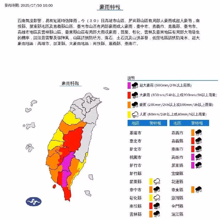 ☔ 氣象署豪雨警戒縣市一覽(截至7/30最新)