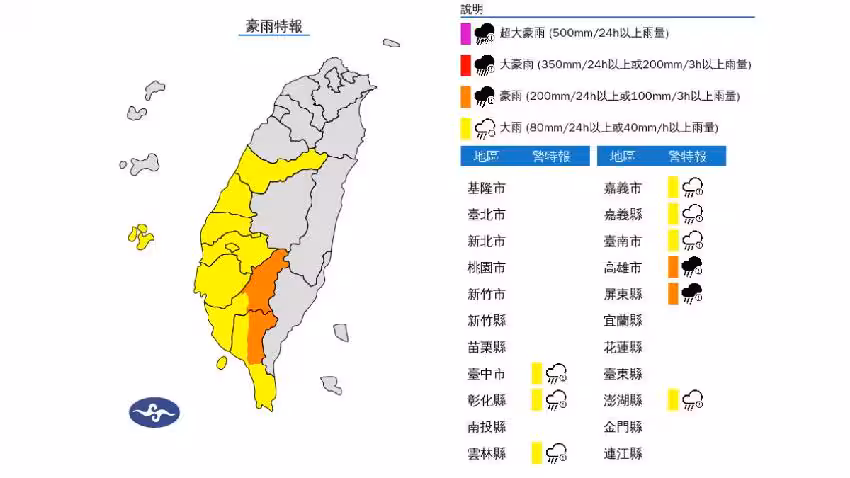稍早,中央氣象署發布豪雨特報,受影響範圍為高雄市山區、屏東縣山區;台中市、彰化縣、雲林縣、嘉義市、嘉義縣、台南市、高雄市、屏東縣、恆春半島、澎湖縣等則須注意大雨,影響時間從今 (4) 日上午至晚間。