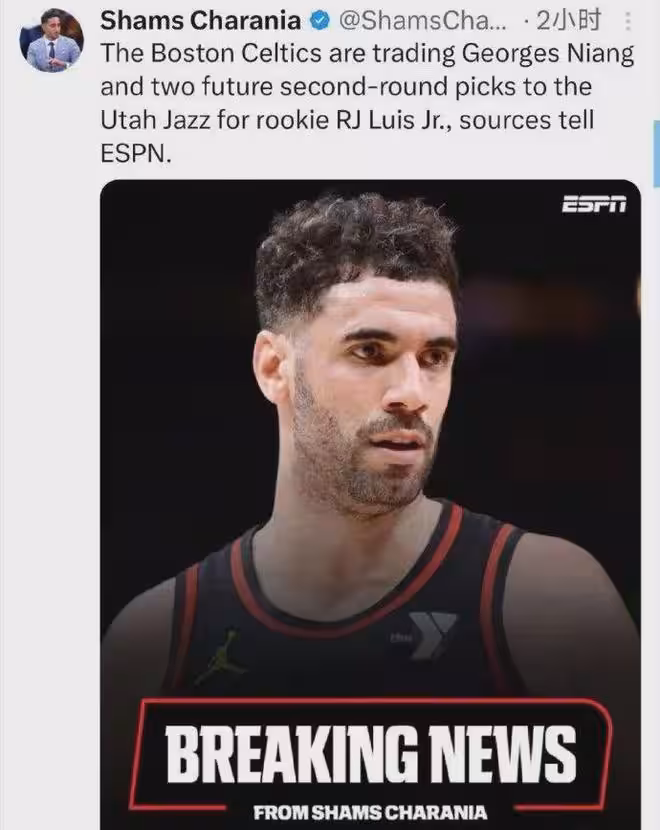 爆料王Shams:凱爾特人將尼昂(年薪820萬美元)和未來兩個次輪簽送至爵士,換回小RJ-路易斯(雙向合同)。