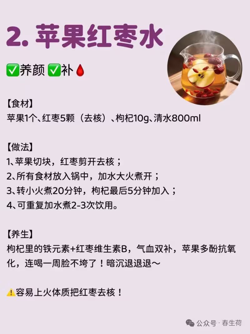 蘋果切塊,紅棗剪開去核,和枸杞(最後 5 分鐘加入)一起放入鍋中,加 800ml 清水大火煮開,轉小火煮 20 分鐘,可重複加水煮 2 - 3 次飲用。