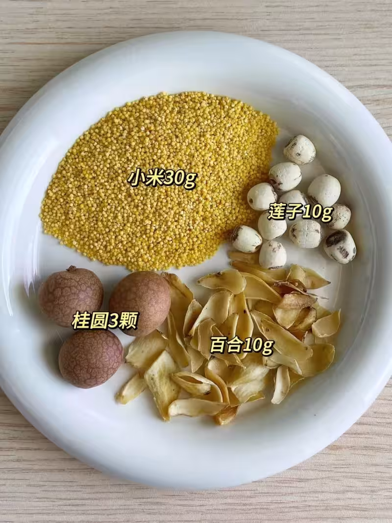 我一般會準備一些小米、蓮子、百合和幾顆桂圓。先把這些材料清洗乾淨,泡上半小時。然後一起放進電飯煲,加足夠的水,選煮粥模式。
