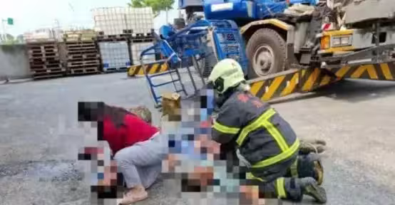 當時吊車準備要將4名工人送上去,執行高空弔掛作業,沒想到吊臂突然斷裂,在吊車上的4名工人被重摔,傷勢嚴重。