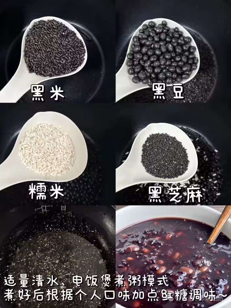 黑米、黑豆、黑芝麻、糯米、紅糖
