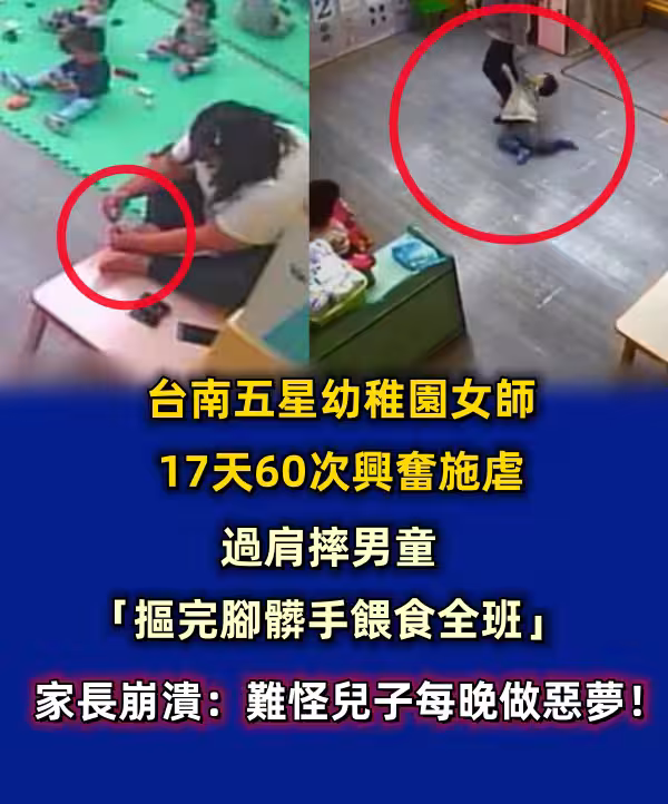 五星級幼稚園女師17天60次興奮施虐,過肩摔男童「摳完腳髒手餵食全班」家長崩潰:難怪兒子每晚做惡夢!
