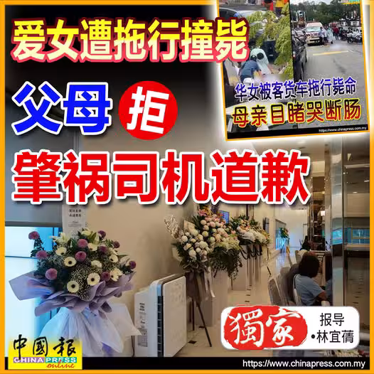 日前華裔女子在隆市舊古仔路被客貨車拖行撞斃一案,女死者父母和男友悲痛欲絕,坦言無法原諒肇禍司機,父母更拒絕司機及相關人士到愛女靈堂致哀。
