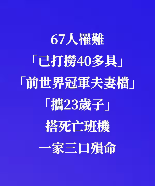 67人罹難「已打撈40多具」!「前世界冠軍夫妻檔」攜23歲子搭死亡班機 一家三口殞命