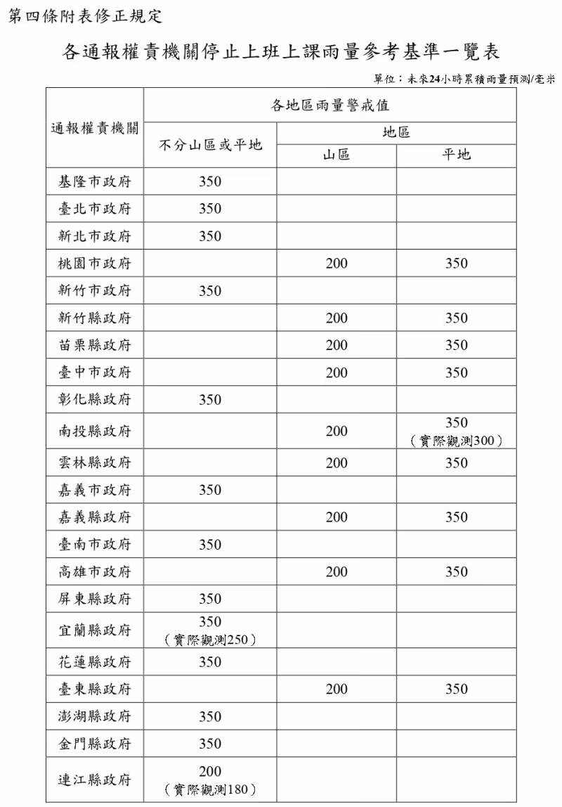 花蓮縣:馬太鞍溪堰塞湖保全戶停班停課;保全範圍學校停班停課(光復國中、光復國小、太巴塱國小);其餘花蓮縣內正常上班上課。