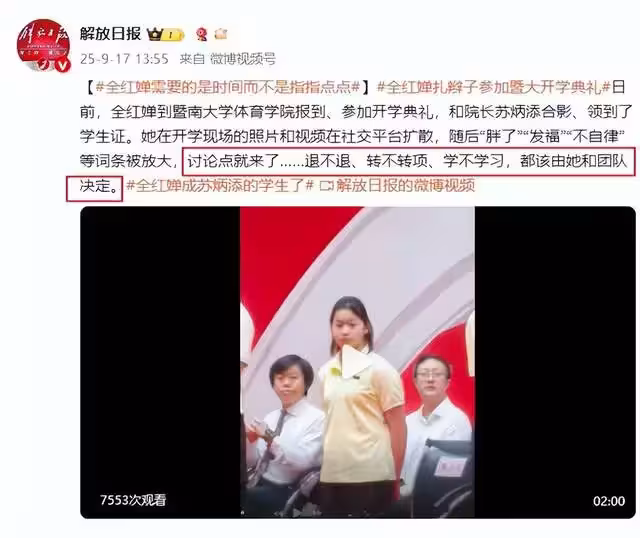 全紅嬋入學4天遭網暴,解放日報怒了:退不退由她自己決定!