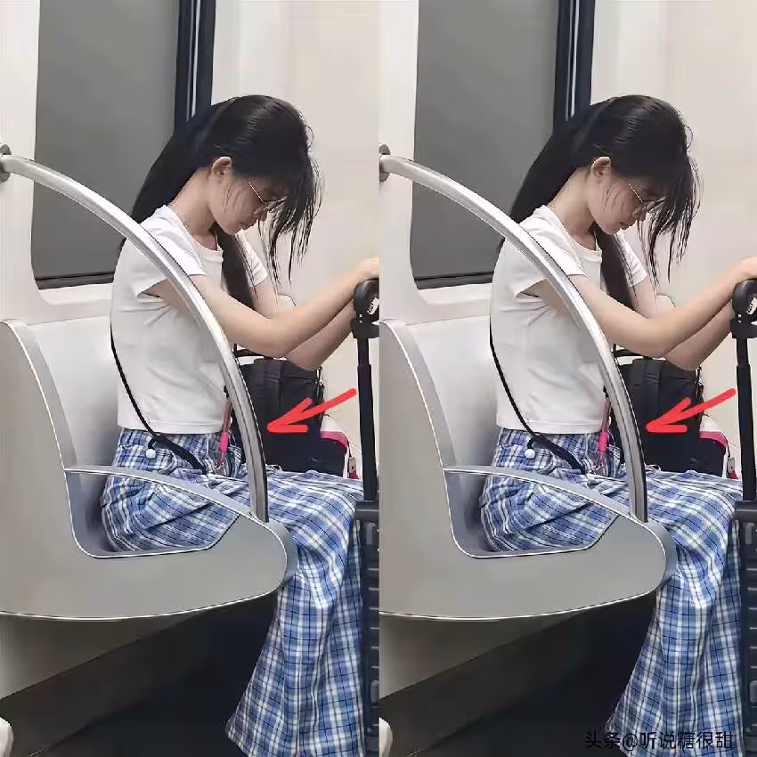 這位女孩,背著一個行李箱和兩個背包,獨自坐在捷運的角落裡。