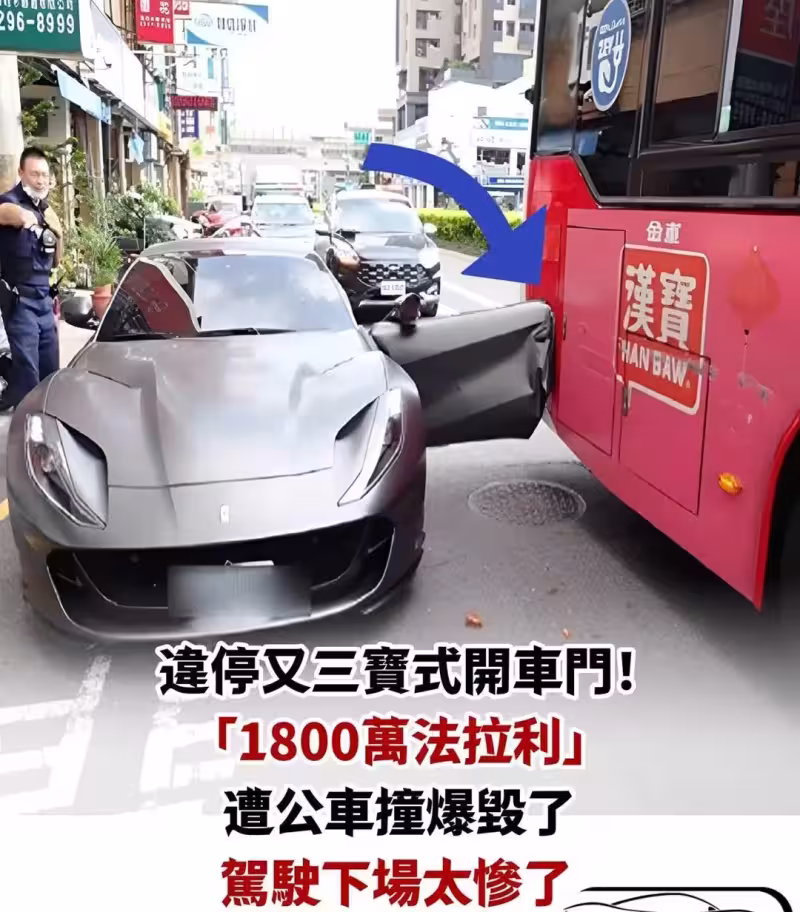 台中市一名46歲陳姓男子,(25)日下午2時許,駕駛一輛1800萬元的法拉利 812 GTS,行經至西屯區河南路二段時將法拉利違規停放在「公車停靠區」,並突然將駕駛座車門開啟,未料剛好有輛公車正要進站,車門與公車發生碰撞,導致法拉利車門變形毀損,所幸雙方均無人員受傷,詳細事故原因由鑑定單位調查。