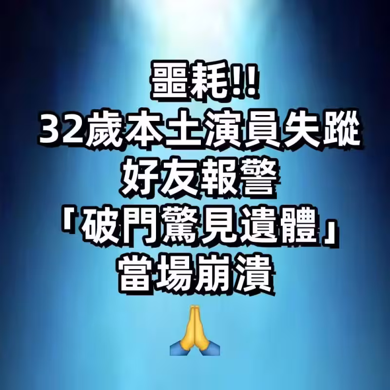 32歲本土演員失蹤!好友報警「破門驚見遺體」當場崩潰 #告別式時間曝光。