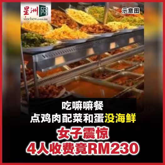 她在貼文中寫道:「這不是開玩笑,沒有任何海鮮的嘛嘛餐,竟然收費230令吉。」