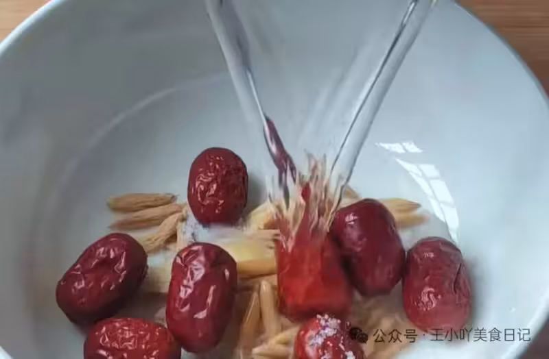 把黃芪、麥冬、紅棗放入盆中,加1勺食鹽(殺菌去污),倒入清水浸泡5分鐘。