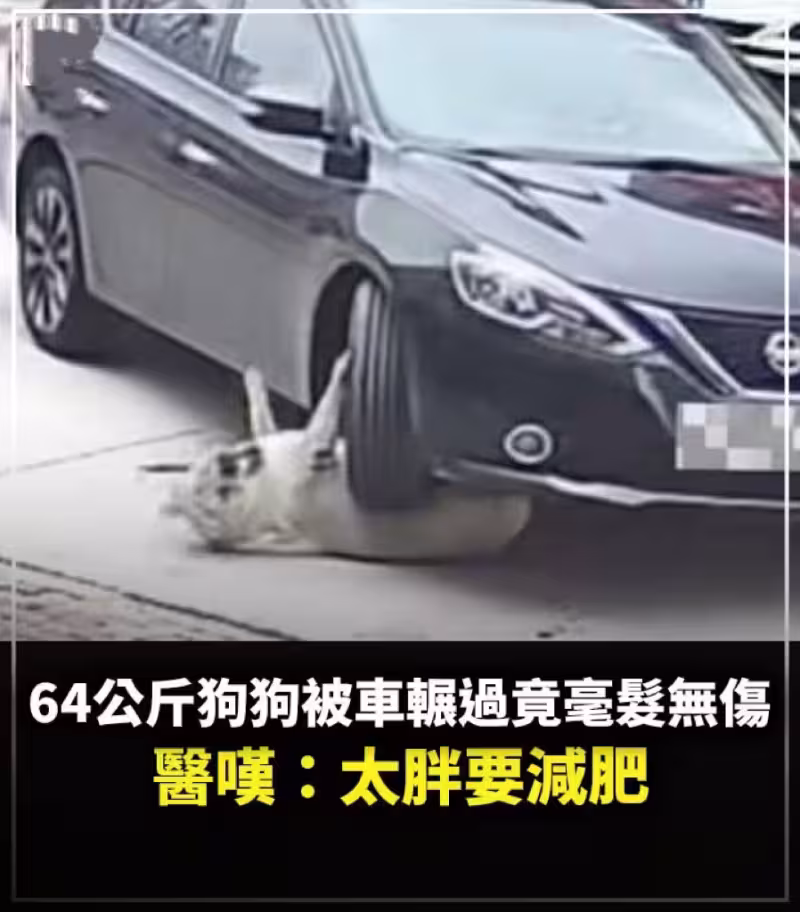 驚險一瞬間!中國杭州有一隻體重達128斤(64公斤)的狗,躺在路中間,結果被轎車輾過,狗主人以為沒救了,沒想到送到寵物醫院後,發現狗狗竟然一點傷都沒有,因為「脂肪護體」救命,但醫生建議要減肥。