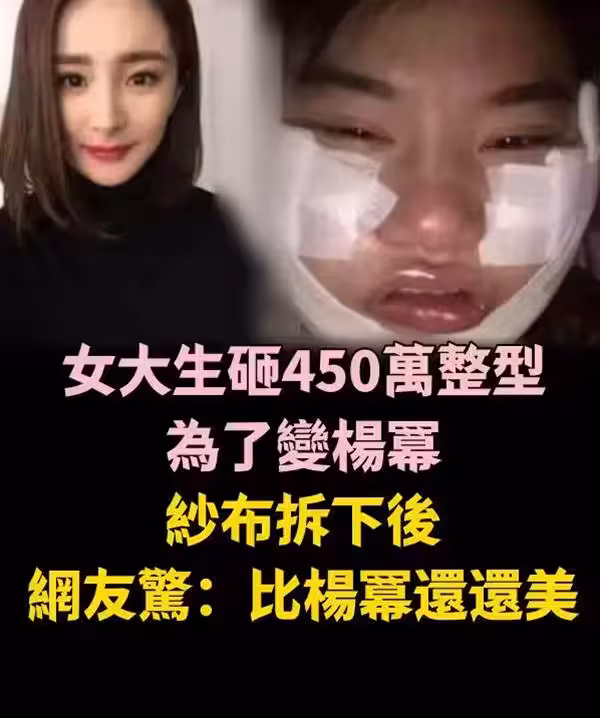 女大生「砸450萬整型」為了變楊冪, 紗布拆下後,驚:比楊冪還還美…