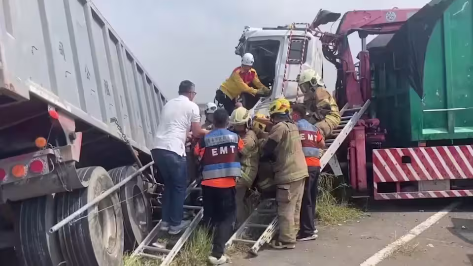 據台南市消防局的救援資訊,地點在安清二號橋旁,今天上午9點56分接獲報案後,土城分隊人車陸續到場救援,抵達後發現狀況非常嚴重,2輛大貨車撞成一團,其中一輛幾乎整輛都被撞進魚塭里。