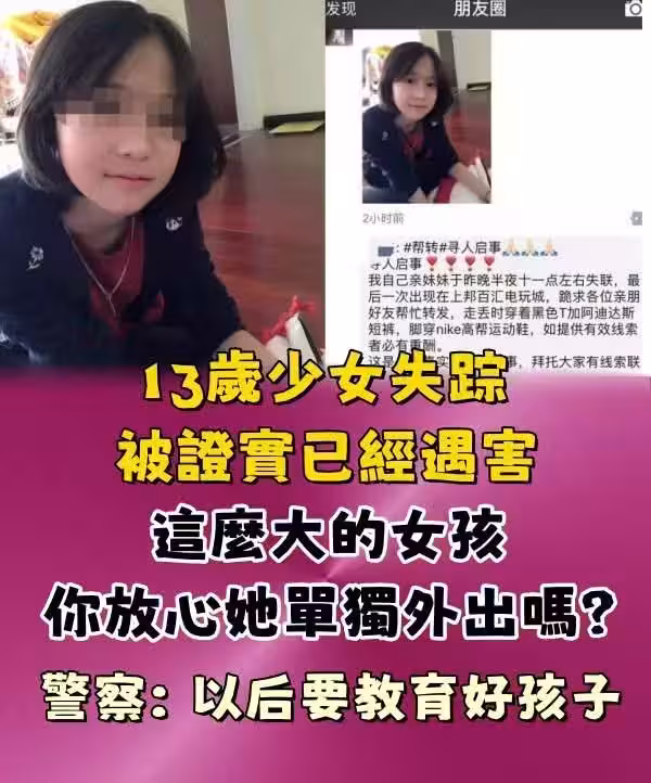 13歲少女失蹤被證實已經遇害,這麼大的女孩你放心她單獨外出嗎?警察:以後要教育好孩子。