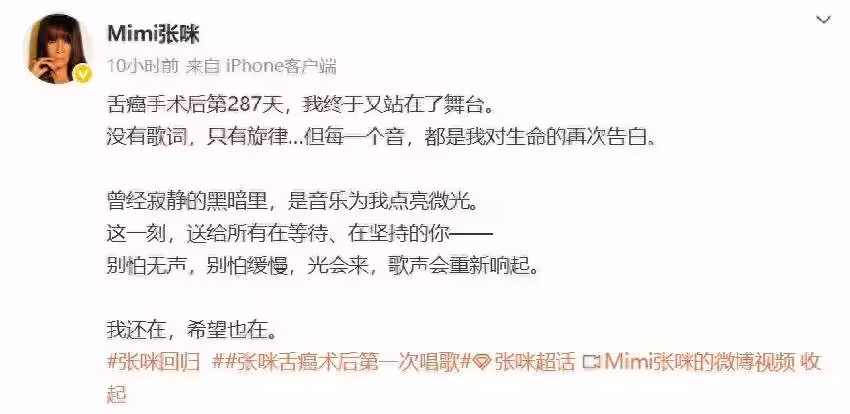 曾發影片自曝確診舌癌的59歲中國女歌手張咪,在社群發布回歸舞台的影片。