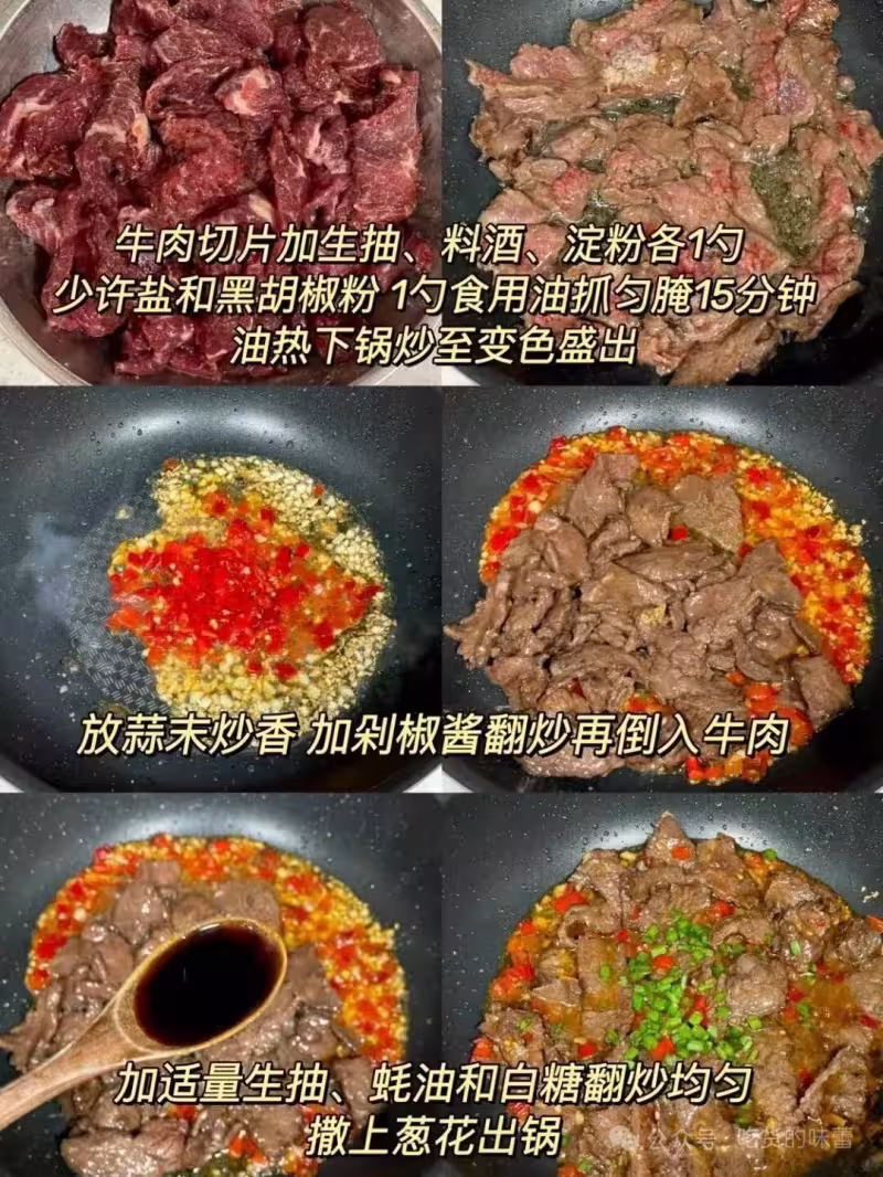 1、牛肉切片加生抽、料酒、澱粉各1勺少許鹽和黑胡椒粉 1勺食用油抓勻腌15分鐘