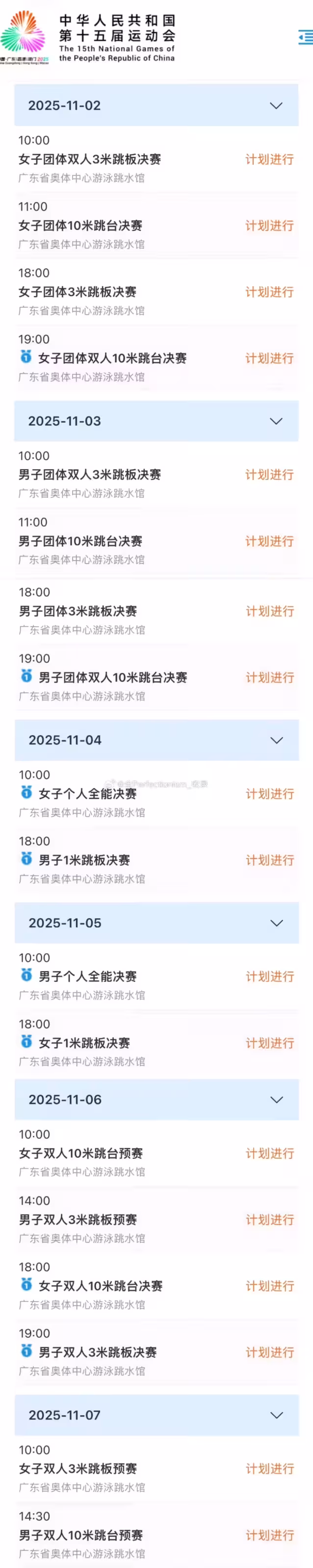 根據今天公布的賽程,第一個比賽日是11月2日,將決出女子團體金牌。女團一共包括4個項目:女子雙人3米板、女子單人10米台、女子單人3米板、女子雙人10米台,全紅嬋將參加女子單人10米台。