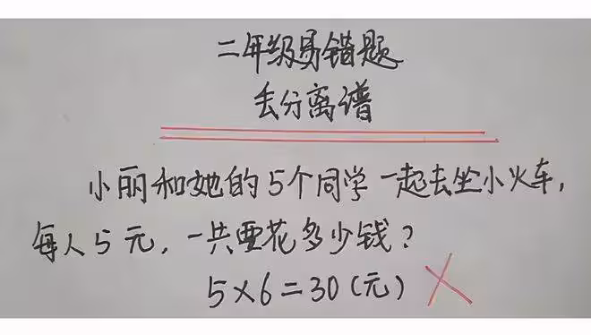 等到老師把正確的答案寫在小學生的作業本上是,小學生這才恍然大悟,大家是否看出小學生到低錯在哪了嗎,其實改正後的正確答案是(5+1)×5=30元。