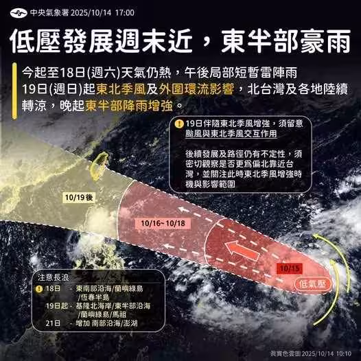 根據中央氣象署資料,今(14)日全台仍多為晴到多雲天氣,白天高溫普遍落在32至35度間;但從周日起,東北季風增強後,北部與東北部高溫將降至25至30度之間,局部地區甚至可能出現大雨或豪雨,其他地區也會明顯轉涼。