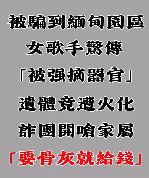 被騙到緬甸園區!女歌手驚傳「被強摘器官」遺體遭火化 詐團開嗆家屬:「要骨灰就給錢」