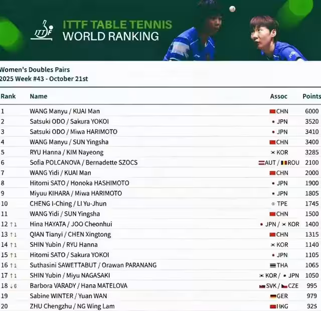 日本兩對組合大藤沙月/橫井咲櫻和大藤沙月/張本美和,位列第2和第3。