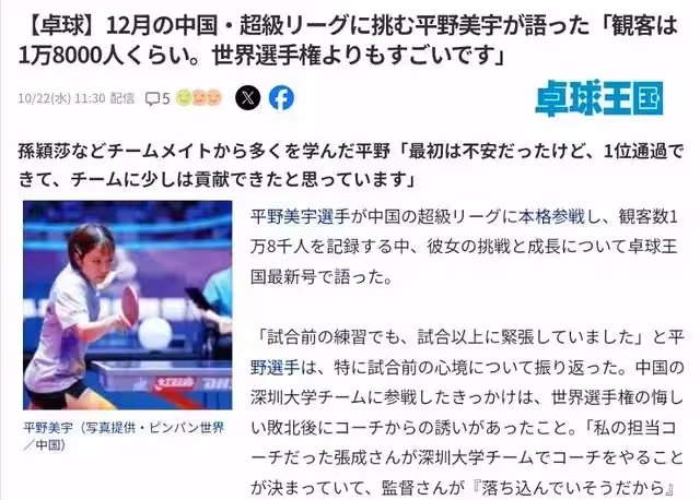 「現場觀眾大概有1.8萬人,比世乒賽還要震撼!」平野美宇在10月22日接受日本媒體《桌球王國》專訪時,這樣描述她參加中國乒超聯賽的感受,這位曾經的世界冠軍坦言,起初接到邀請時她正因世錦賽失利而信心受挫,甚至出現了過度呼吸的情況,然而,聽說能與世界排名第一的孫穎莎在同一隊伍,她僅考慮了短短5分鐘就做出了決定,「我去」,跨國交流的溫暖與挑戰,在平野美宇的講述中緩緩展開,也映照出中國乒協主席王勵勤為何將乒超聯賽視為推動桌球運動發展的重要一環