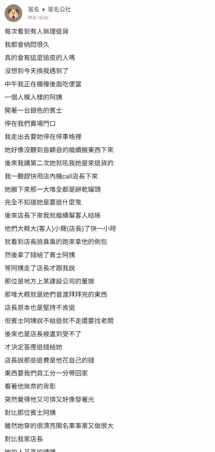 也有曾在賣場工作過的人認證:「以前做大賣場就遇過不少這種傢伙了,來退貨的東西上面都有插過香的痕跡」、「很多這樣的人、我們賣場有人過年買麻將桌3天後開休旅車載回來退、真不要臉,而且看的出來拆過一直睜眼說瞎話沒拆過」、「很多人都這樣,還有社區的管委會也這樣搞,但是放心,錢管委會還是已經花掉不會補回去喔!通常農曆7-8月我都不去好X多跟各大賣場買飲料餅乾乾料,只有X北我知道他們店員是完全不給退」。