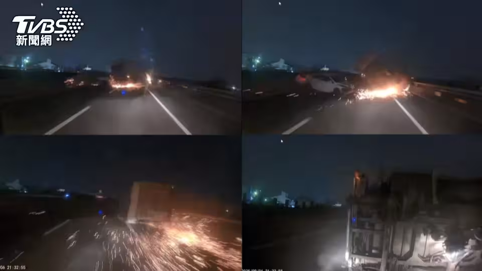 而在台66線東向25.2公里處,6日晚間9點多也發生了一起三車連環追撞事故。現場可見一輛白色轎車車尾嚴重損毀,一輛大貨車側翻橫躺在車道上,造成交通大亂。事故發生時,大貨車撞上小客車瞬間冒出火花並當場翻覆,被撞的小客車旋轉360度後停在車道上,後方車輛因無法及時反應而跟著撞上去。