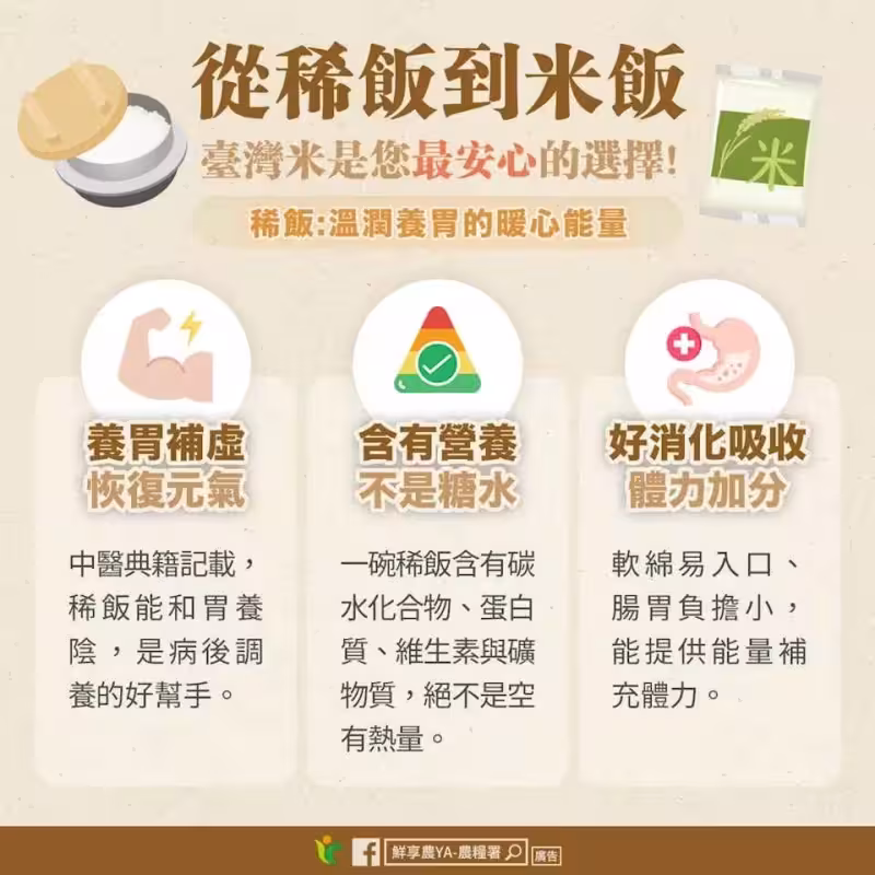 農糧署引用《本草綱目》、《傷寒雜病論》、《食療本草》,指出米湯能「和胃、養陰」、「補虛止渴,養胃氣」,是適合病後虛弱、口渴之人食用,幫助病人恢復;而《千金要方》顯示,藥後用米湯「調和藥性」,這些經典皆表示稀飯並非「沒有營養」,而是養胃、復元的好食物。