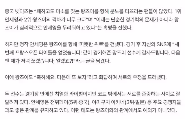 韓媒《OSEN》評論到:王祉怡與安洗瑩在賽場上是競爭對手,但在球場外是相互尊重的關係,兩人一直保持著密切的關係,安洗瑩還跟山口茜、陳雨菲保持著良好的關係。實際上安洗瑩在比賽結束後第一時間就關心了王祉怡的身體狀態,很多人指責王祉怡,可安洗瑩卻給了王祉怡尊重與安慰。