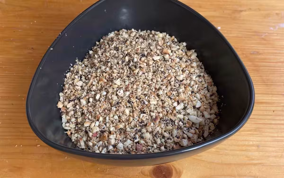 準備一碗的花生,下鍋炒熟,聽到花生在鍋里噼里啪啦的響,聲音結束花生也差不多熟了,盛出放涼,黑白芝麻小半碗也放進來炒熟,白芝麻微微發黃就可以了,這裡要注意小火慢炒,炒熟也要把熱氣散開些,再盛到碗里,放涼的花生我們輕鬆就去掉花生衣,清理好的花生和黑白芝麻都倒進保鮮袋裡,搟麵杖搟碎,倒入碗里。