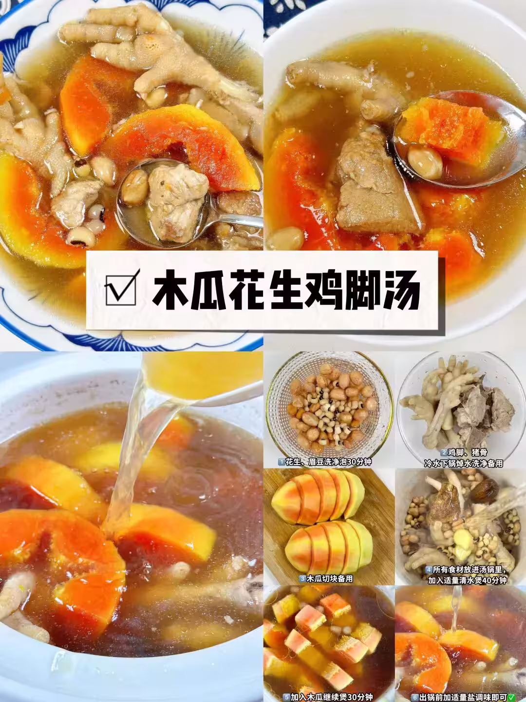 製作步驟: 花生、眉豆洗凈泡30分鐘 雞腳、豬骨 冷水下鍋焯水洗凈備用 木瓜切塊備用 所有食材放進湯鍋里, 加入適量清水煲40分鐘 加入木瓜繼續煲30分鐘 出鍋前加適量鹽調味即可 ✅三、板栗山藥雞🐔湯