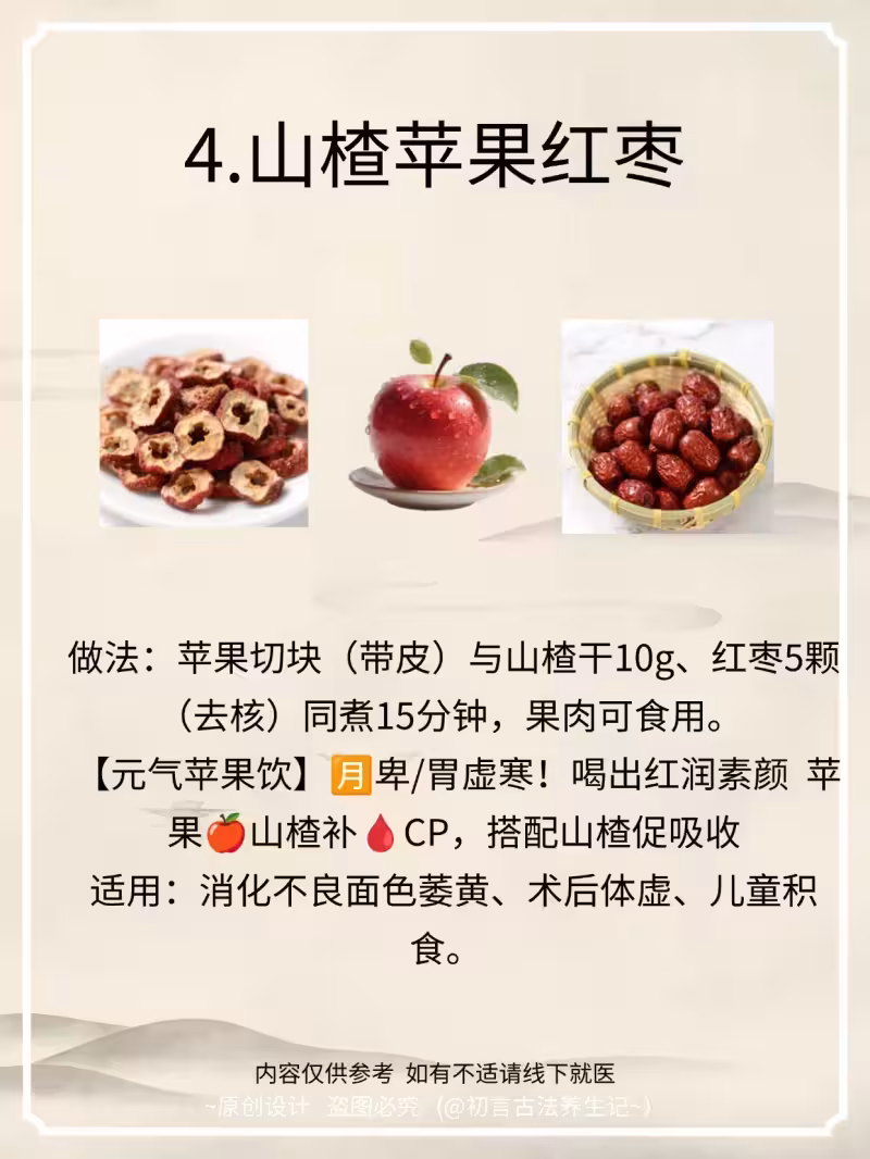 做法:山楂干6g、桂花2g、桂圓6顆(去殼),紅糖1塊,煮水10分鐘趁熱飲。