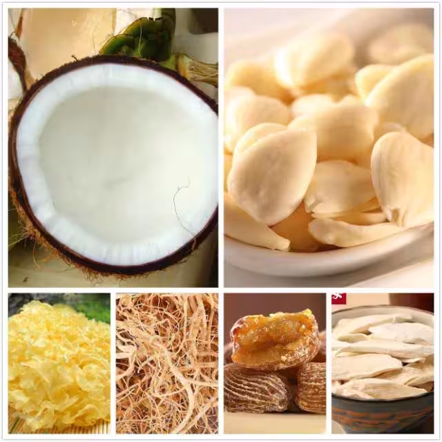 椰子潤肺湯 椰子肉,1個。 淮山,1兩。 南北杏,1兩。 雪耳,少量。 參須,少量。 蜜棗,2個。 功效:潤肺,除煩。