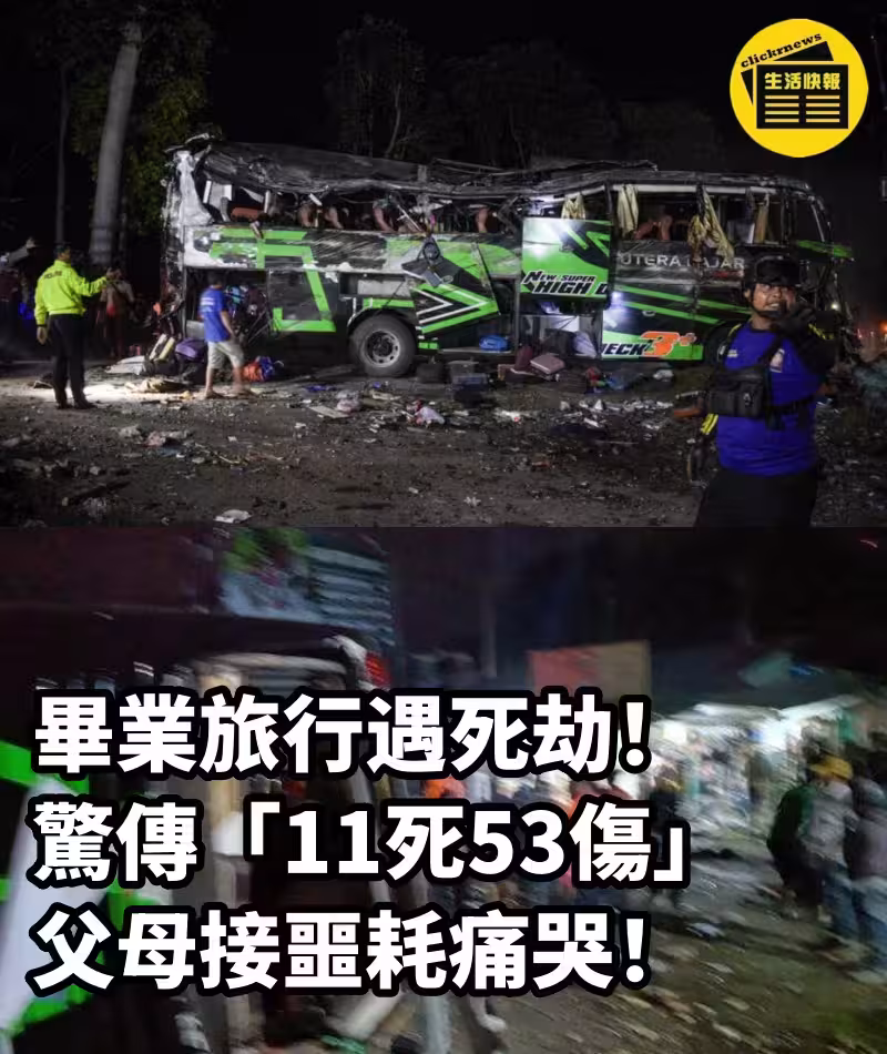 原本的快樂畢業旅行,居然成為了奪命之旅!印尼西爪哇省(West Java)近日發生一起可怕交通事故,一台載滿超過60名高中生的遊覽車,因失控造成連環車禍,導致至少11人死亡,53人受到輕重傷,許多學生家屬得知噩耗後都完全無法接受。