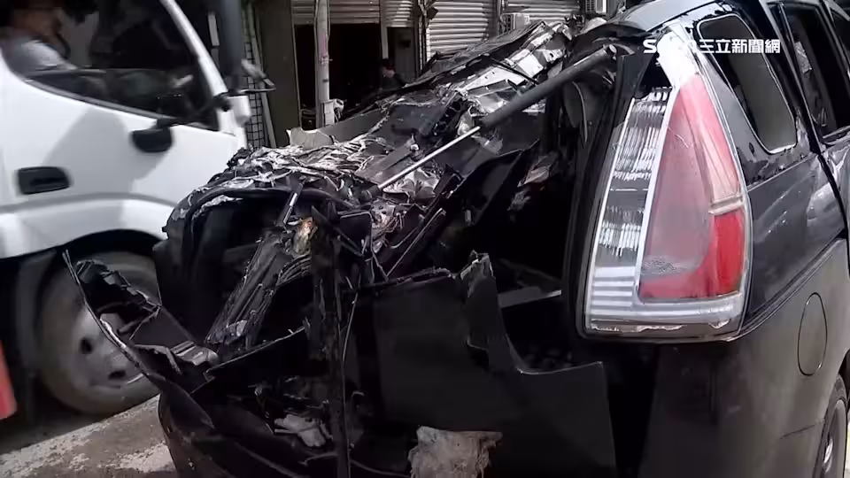 一台黑色小客車車頂硬生生凹了一塊,擋風玻璃碎裂,往後面一看,車尾變得扭曲變形,根本看不出原本樣子,另一台車也是很慘,車尾凹了一塊,這兩台車變成廢鐵,疑似是裝甲車給壓過。