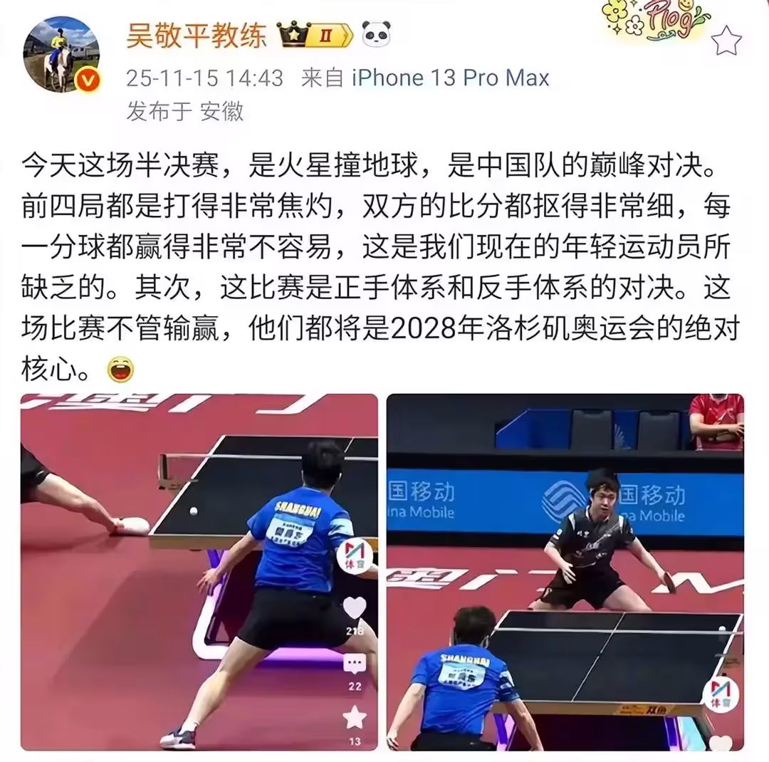 值得玩味的是,在弟子加冕時刻,恩師吳敬平對決賽與半決賽評價的反差引發爭議。這種"親疏有別"的言論,無意間襯托出樊振東始終如一的謙遜品格。正如網友所言:"小胖用實力說話,更用行動做人。"在全紅嬋等新生代運動員頻頻引發爭議的當下,樊振東展現的不僅是技戰術層面的統治力,更樹立了新時代運動員應有的職業操守與人文情懷。